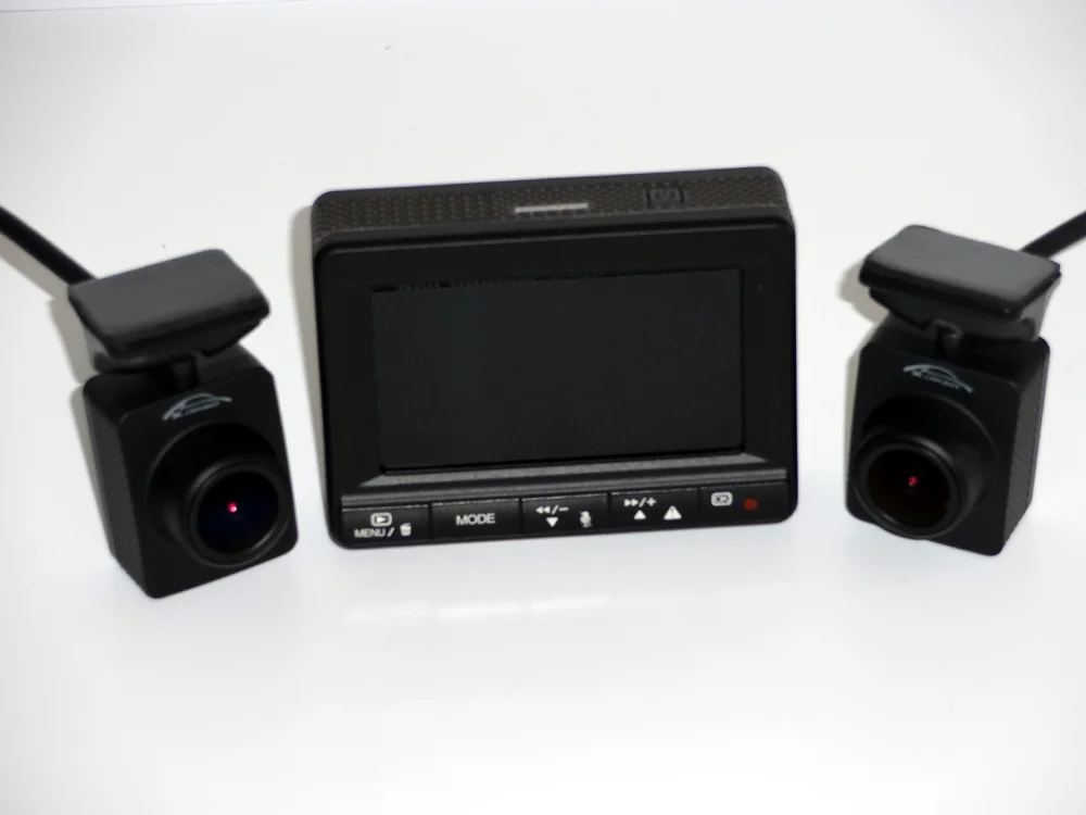 what is unique is the the 2 separate dual lens (front & back) cams recording to only 1 micro sd card at the same time. Front Cam Lead is 3ft. Back Cam Lead is 9ft